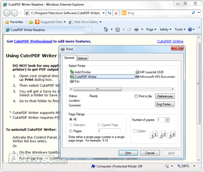 CutePDF Writer (formerly CutePDF Printer) is the free version of commercial PDF creation software.